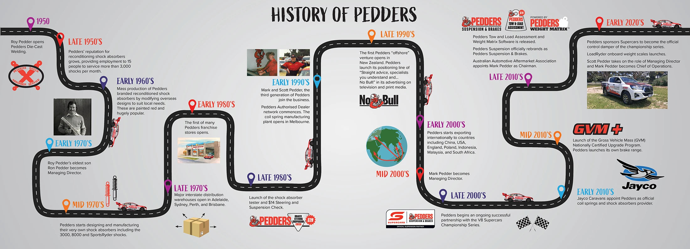 Pedders ก่อตั้งขึ้นในปี ค.ศ. 1950 โดย Roy Pedder ในเมือง Melbourne ประเทศออสเตรเลีย เริ่มแรกนั้นเป็นธุรกิจครอบครัวเล็ก ๆ ที่ซ่อมแซมและจัดจำหน่ายระบบกันสะเทือนของรถยนต์